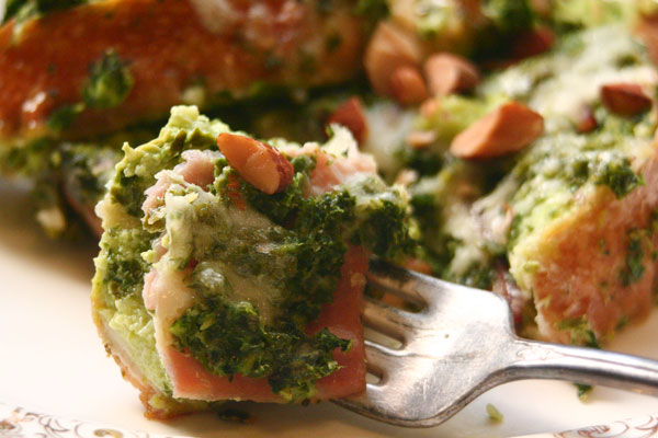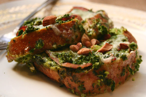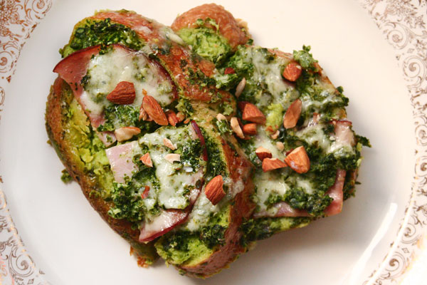 I hope you try this rather yummy dish. It’s perfect for any meal. But, I think it would be awesome at a brunch with family or friends. You can use any kind of bread that you want. To make it a bit healthier, I’d go with a whole grain, whole wheat bread. But, I had some stale French bread, so that’s what I used. It’s a great way to use the greens that are so good for you, and are in season right now. (If you need another way to use greens, my brother gave me his recipe for Green Smoothies. They are delicious and full of healthy ingredients.) I used ham, but bacon would also be amazing (cooked then crumbled over top when serving). Another option would be to omit the meat altogether and add some more almonds when serving, for some lean protein.
