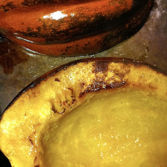 - 2 acorn squash, halved (seeds removed – save them to plant in your garden!)