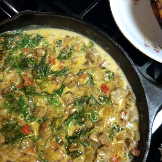 - Add nutmeg and kale (a little bit at a time, letting it wilt down then adding more), stirring often, until all kale is incorporated.