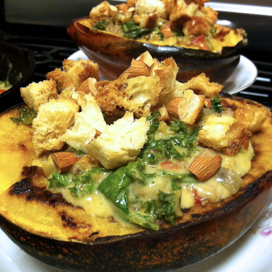 My cousin, Tim, told me about this recipe for a stuffed pumpkin that they’d loved. I thought about an acorn squash I’d been meaning to use, and all the yummy things I had in my kitchen that could make a tasty filling, and made up my own version. Um, yes, I’m glad this happened. It was goooooood! Thanks for the idea, cousin Tim!! 🙂